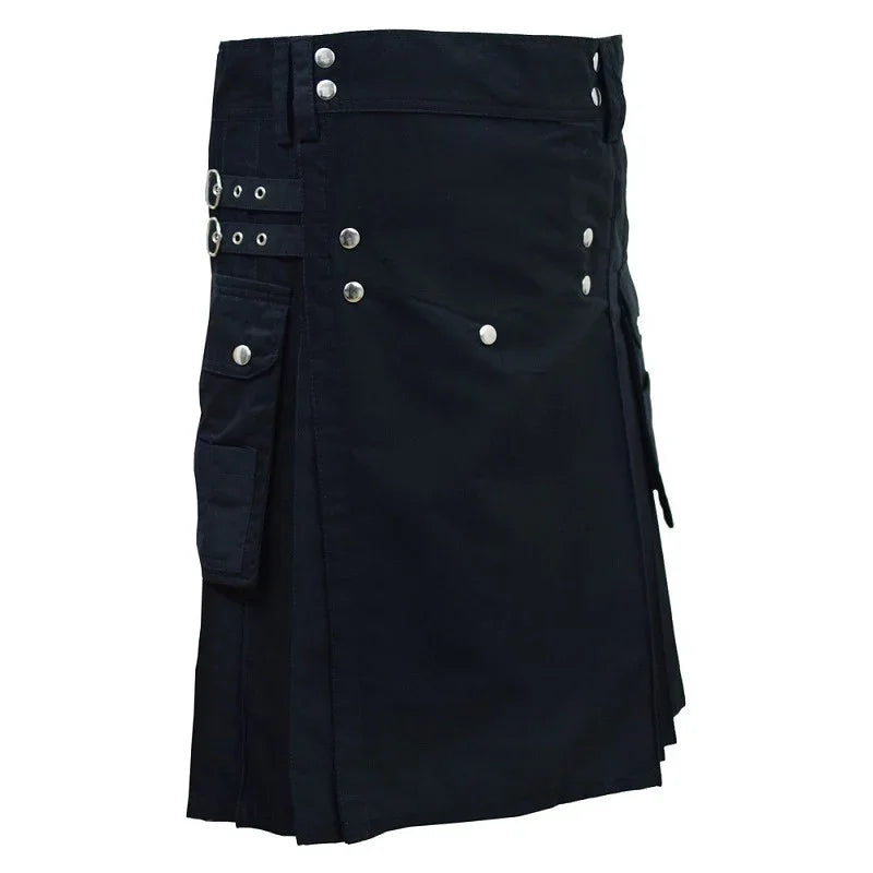 Men Black Leather Straps Fashion Sport Utility Kilt Deluxe Kilt Adjustable Sizes Black Colour 2" Variation Kilts Drop 24" Inches Designed for sports events, fashion, rock events. 100% Cotton durable & fine quality material. 2 Large Cargo Pockets On Both Side sizing : 24x15cm. 2 Leather Straps allow the kilt to be adjusted using snap buttons by 2" downwards. Brass Material Kilt Weight from 13-22oz depending on the size. Please check the videos on you tube HOW TO MEASURE YOUR KILT before buy so you will get a correct size for you. Thanks