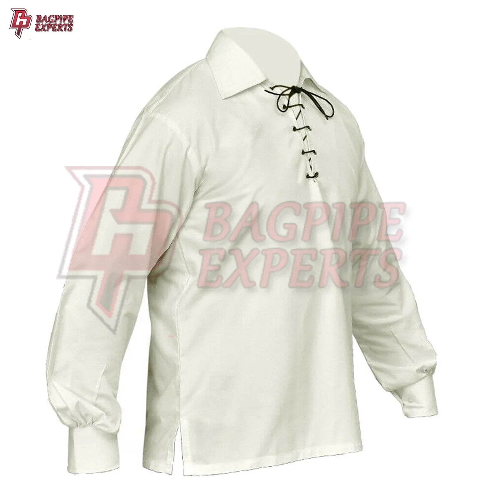 The lace-up neckline with genuine leather cord and full sleeves capture the authentic charm of Scottish Highland dress, while the subtle off-white tone adds a touch of sophistication. Whether for a Highland gathering, wedding, Celtic festival, or Renaissance fair, this shirt is your go-to for a distinguished and versatile look.