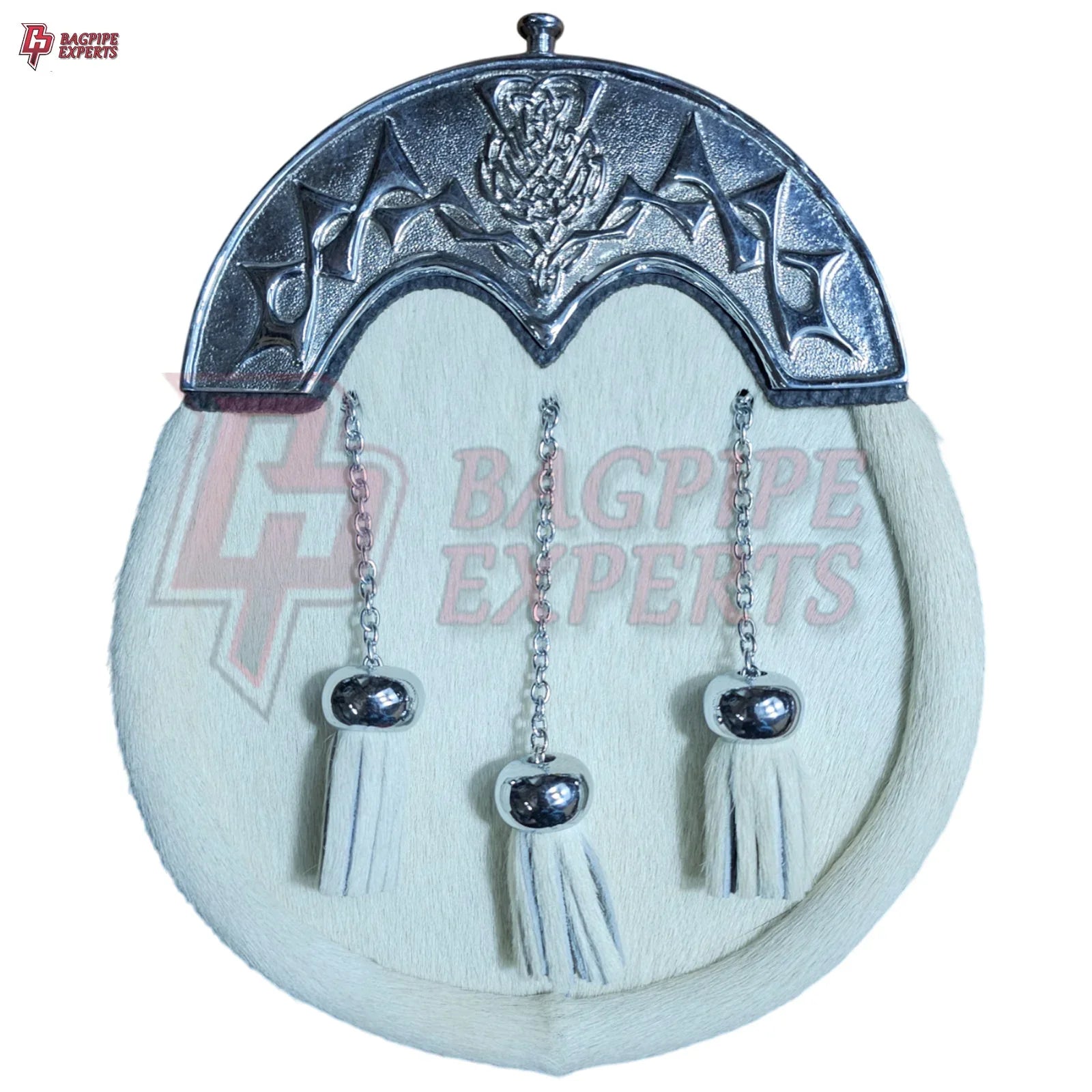 Complete your Highland outfit with the Elegant White Dress Sporran, blending timeless Scottish tradition with refined craftsmanship. Featuring soft white fur, three decorative tassels, and a polished chrome cantle adorned with intricate Celtic engravings, this sporran adds a distinguished touch to any formal kilt attire.