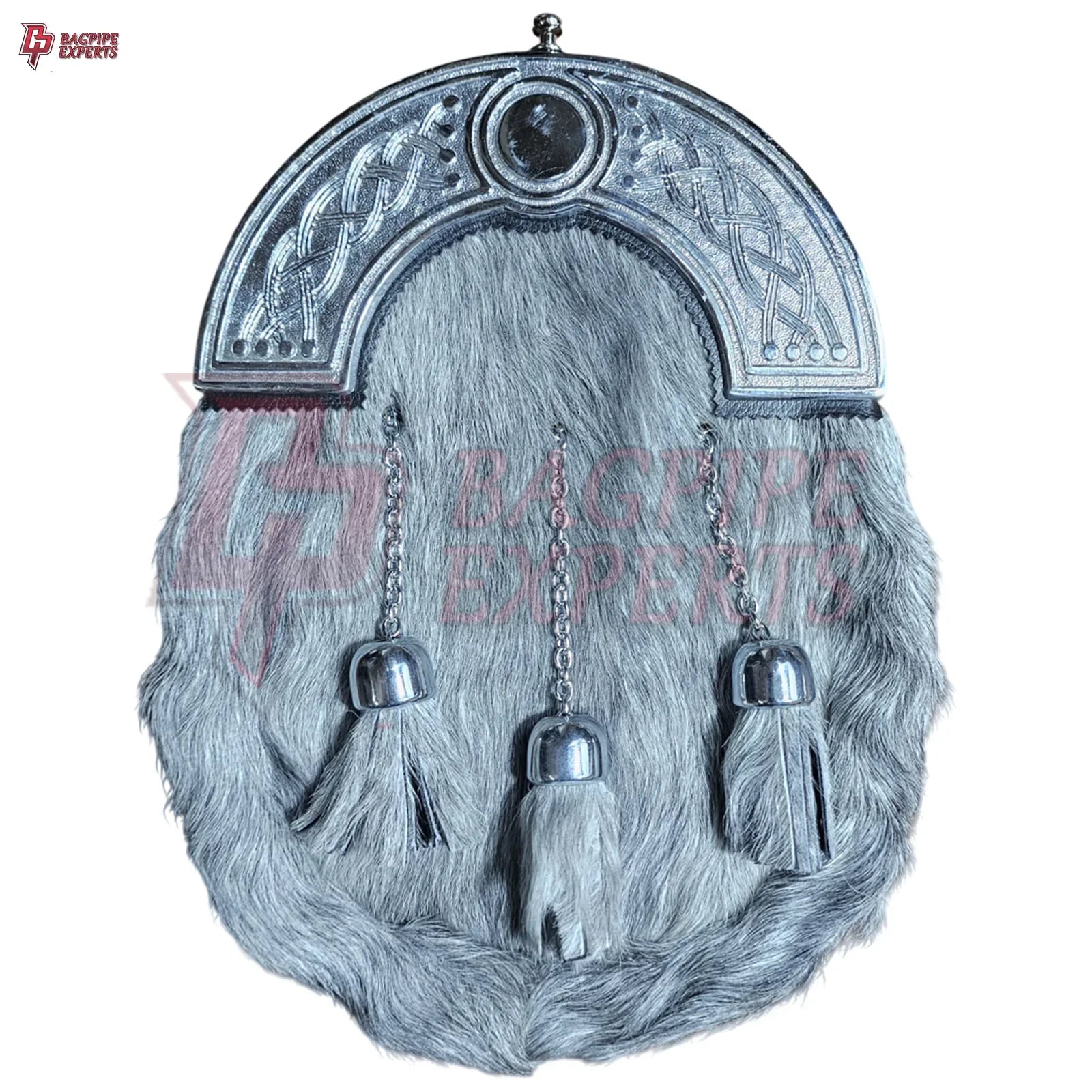 Premium Grey Fur Dress Sporran – Chrome Cantle with Intricate Celtic Design